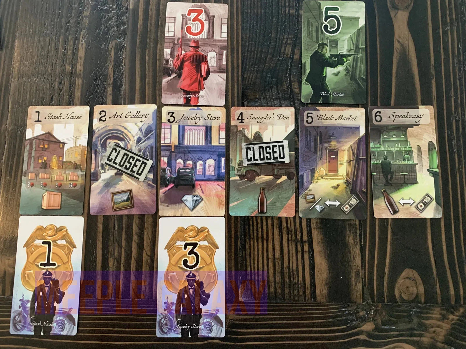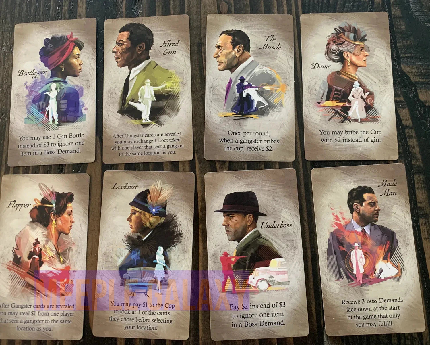 In Gangster's Dilemma, you play a gangster eager to satisfy the Mob Boss' demands. Each round, you will secretly choose to loot one of the city's hot spots, in hopes of eluding the cops, avoiding other gangsters, and grabbing crates, art, jewels, gin, and cash when possible. But the cops are on patrol at all times and they randomly search those same hot spots. If caught in the presence of another gangster, do you pay bribes to the cops, stay silent, or rat out your fellow gangsters? What a dilemma!