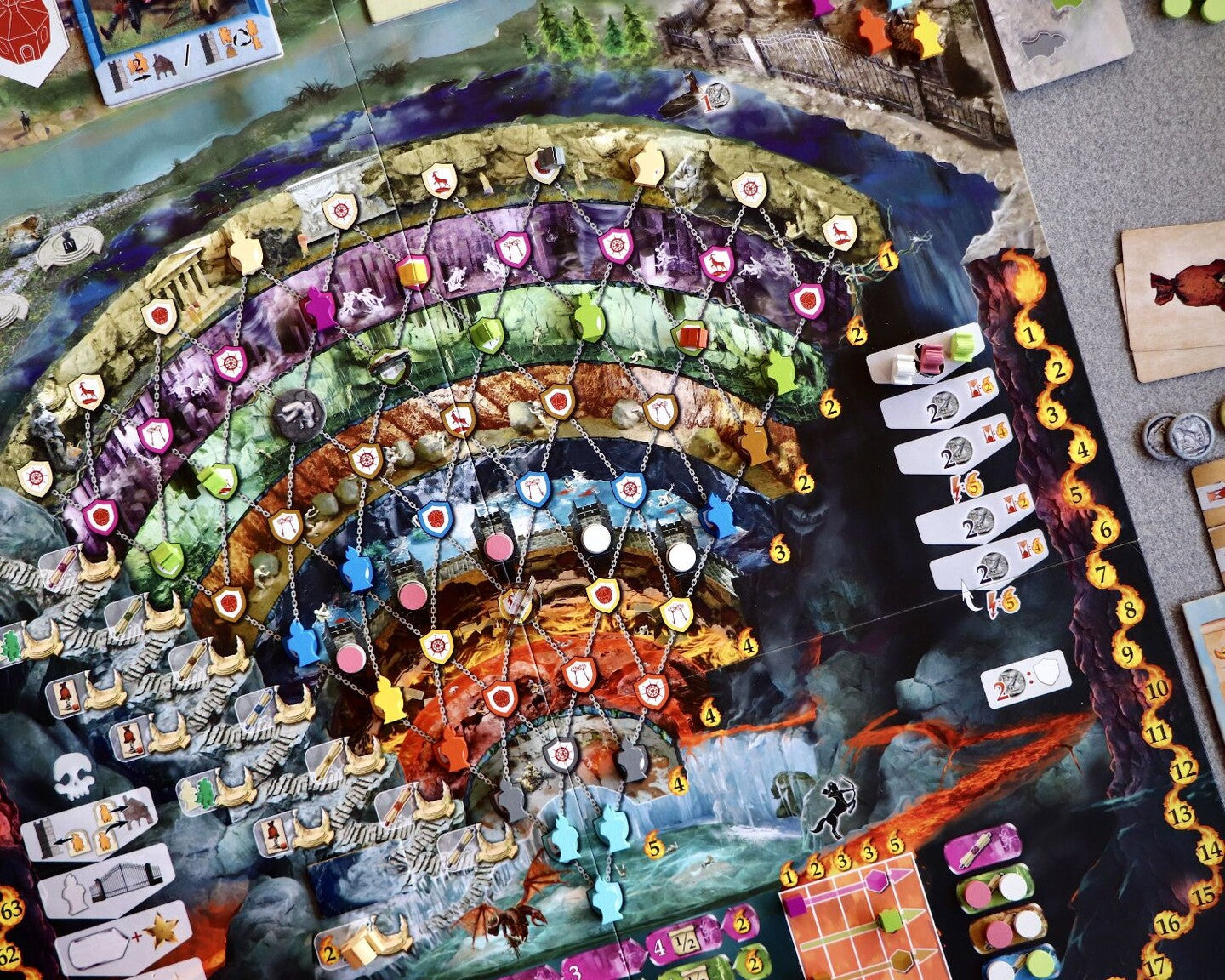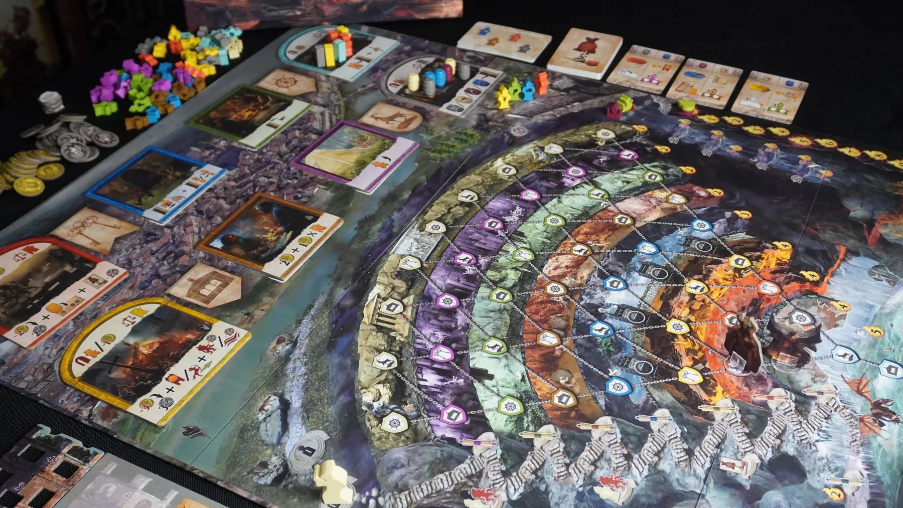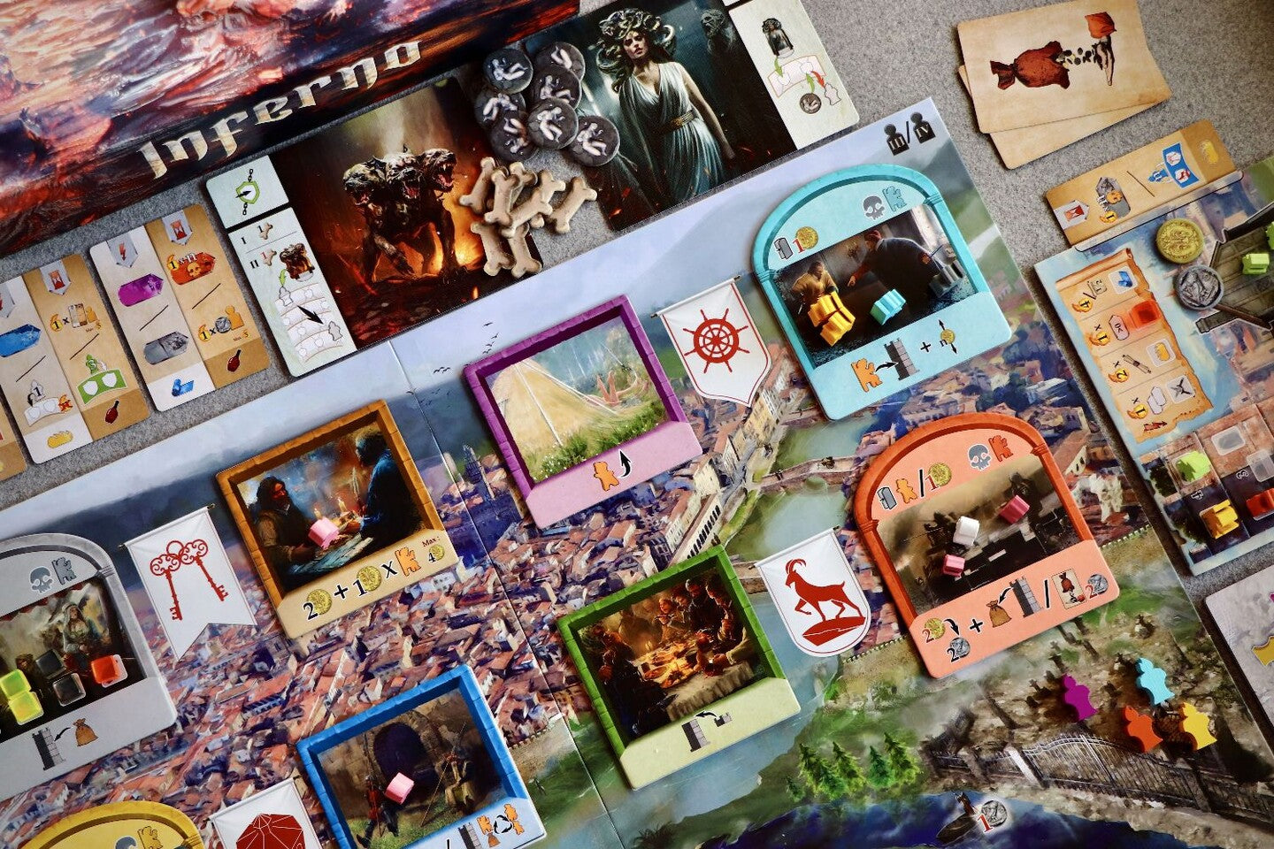 Inferno is a soul management game where each player must guide sinners to their respective circles in Hell. The central board consists of two parts: one displaying all 9 circles and the soul registry, while the other represents Florence in the early 14th century, where Dante lived, with its power games and palace intrigues.