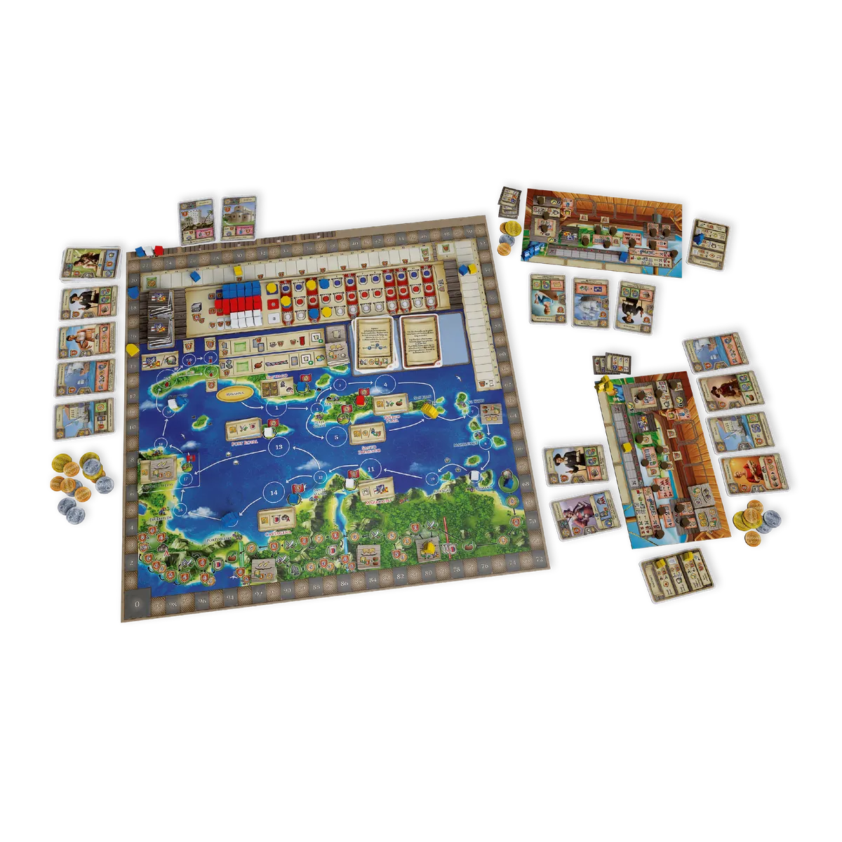 The players sail on a round course through the Caribbean, e.g., you have city tiles where you are able to perform various actions or deliver goods to. One special feature is an implemented quest mode over more and various tiles, which tells the player, who chase after it, a little story.