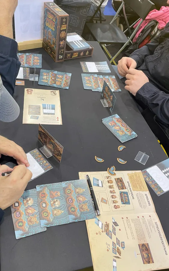 At the beginning of Temple Code, each player receives a combination card with a series of three unique statuettes that everyone can see but themselves. Each round, two combination cards are dealt face-up in front of each player. On your turn, pick a set of cards in front of another player, then take one for yourself and give them the other one. By aligning this card next to the one you're trying to guess, you will get hints about the matching statuettes: each blue circle indicates a statuette that is on both cards at the same place, and each orange triangle stands for a statuette that is on both cards, but in different positions.
