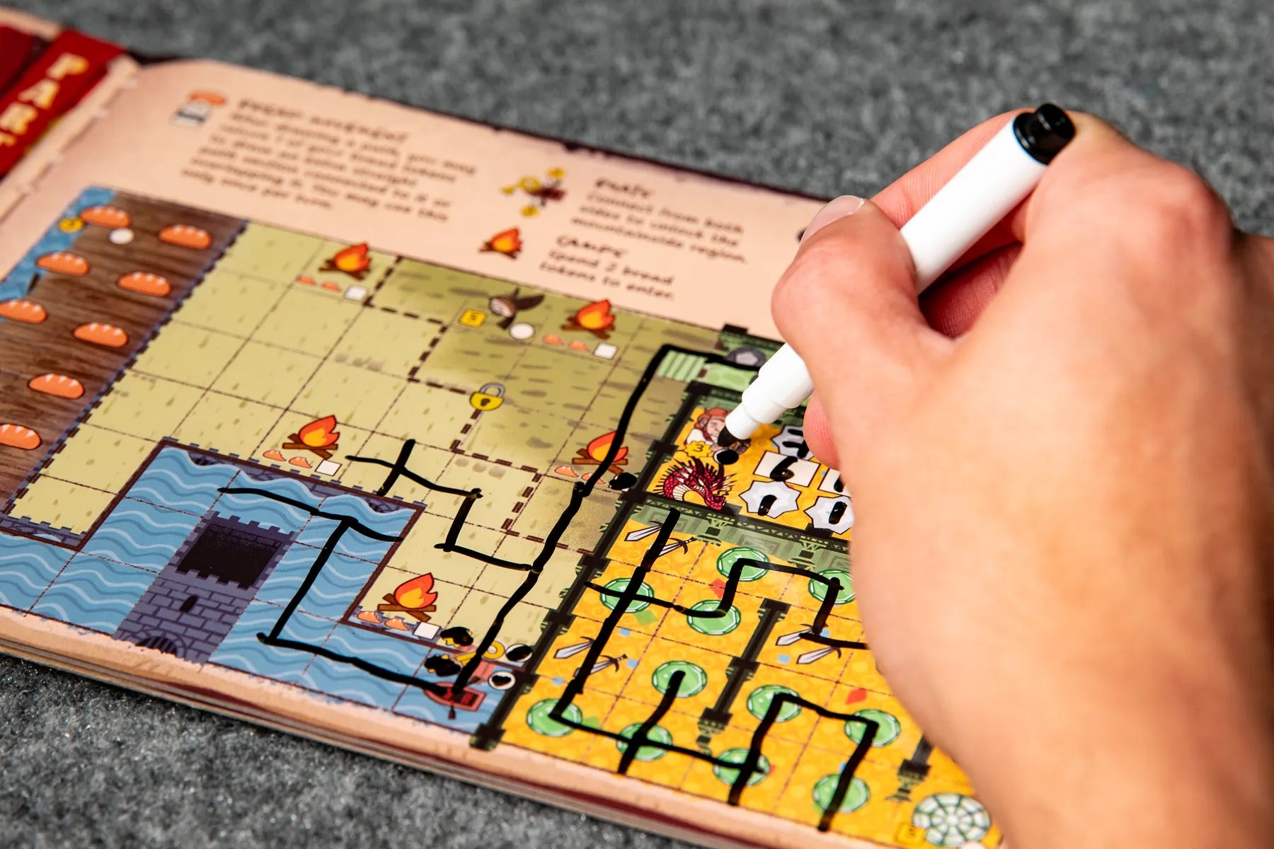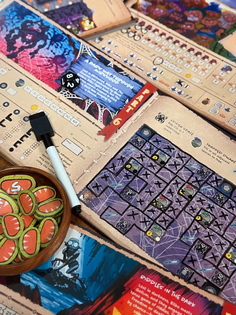 With your chosen dice, you use a dry-erase pen to mark the current chapter of your book, drafting a path to evade trolls, battle goblins, solve riddles, and pen the best conclusion to each chapter. The game takes players through the eight most iconic challenges faced by Bilbo and the Dwarves in The Hobbit, such as overcoming trolls, goblins, wargs, and giant spiders; reclaiming the treasure of the dwarves; and defeating the dragon Smaug. In the end, you want to complete the most rewarding journey to The Lonely Mountain.