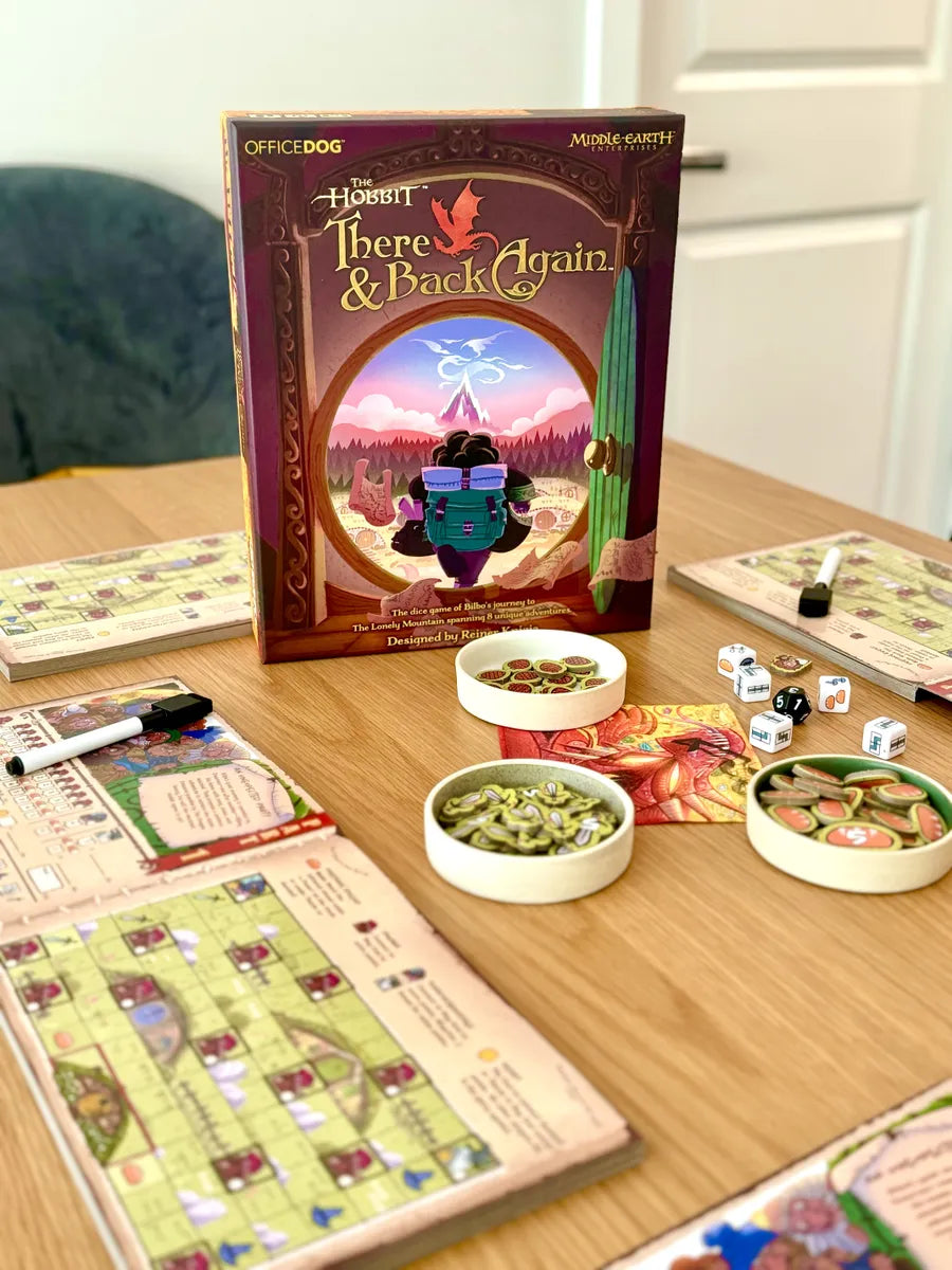 The Hobbit: There & Back Again is a competitive adventure game in which players draft dice to make pathways, collect resources, and perform actions that help them to reach their chapter goal.
