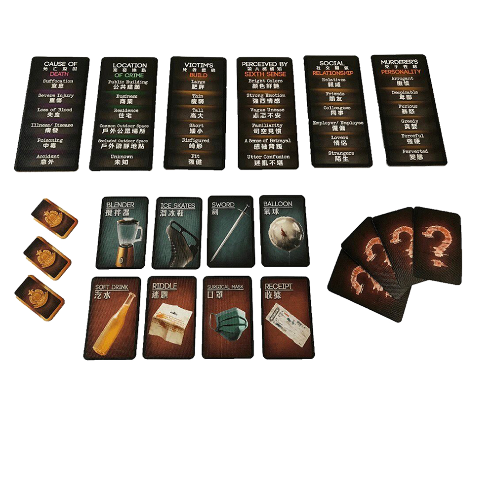 The Murderer tries to hide their role and look for a scapegoat. Even if they are identified, the Murderer still wins the game if no one correctly identifies both the “Key Evidence” and the “Means of Murder”.