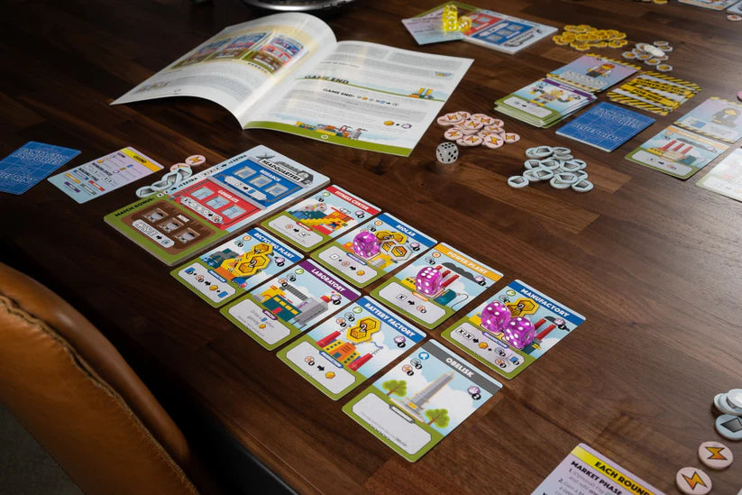 During the work phase, all players simultaneously roll their dice and use their dice as workers to run factories. Factories start as blueprints and need to be constructed. Once constructed, each factory can be used once each turn. Worker placement can happen in any order and figuring out the correct sequence can enable a powerful chain of actions. Additionally, you can build training facilities that allow you to manipulate the dice values of your workers. Each work phase is like solving a unique worker placement puzzle in order to optimize your output of resources and goods.