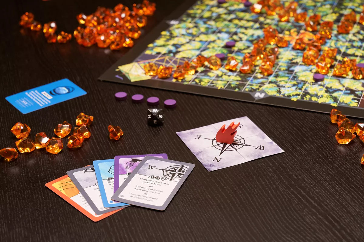 While manning your fire tower you notice smoke in the distance and pull out your radio to report a blaze growing somewhere in the forest. You must protect your tower with all the resources at your disposal: dispatch fire engines to combat the blaze, order air drops of water, and plan the building of firebreaks. Competing fire departments will complicate your work, using the unrelenting winds to their advantage in an attempt to safeguard their own towers and threaten yours. The chaotic Firestorm also stalks the deck and will dramatically swell the flames each time it is drawn. Will you effectively use your forces to outwit your opponents and survive the inferno? Can you be the last tower standing?