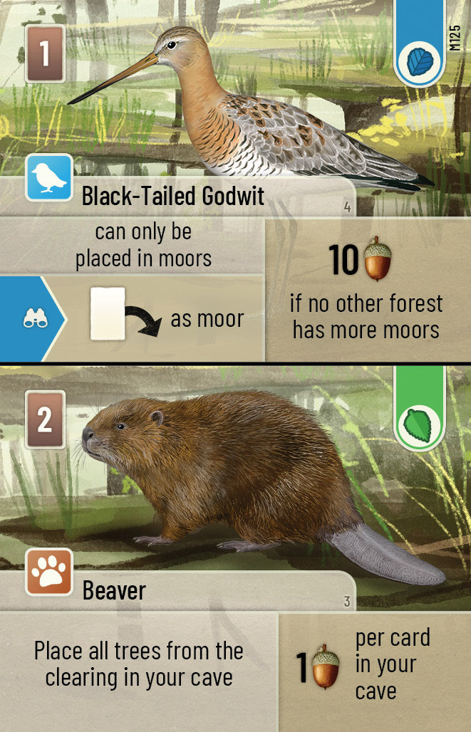 The game mechanism stays untouched: To start, each player has six cards in hand, with cards depicting either a particular type of tree, shrub or terrain or two moor dwellers (animal, plants), with these latter cards being divided in half, whether vertically or horizontally, with one dweller in each card half. On a turn, either draw two cards — whether face down from the deck or face up from the clearing — and add them to your hand, or play a card from your hand by discarding other cards to pay the cost, then putting that first card into play. In the end, the player with the highest score wins.