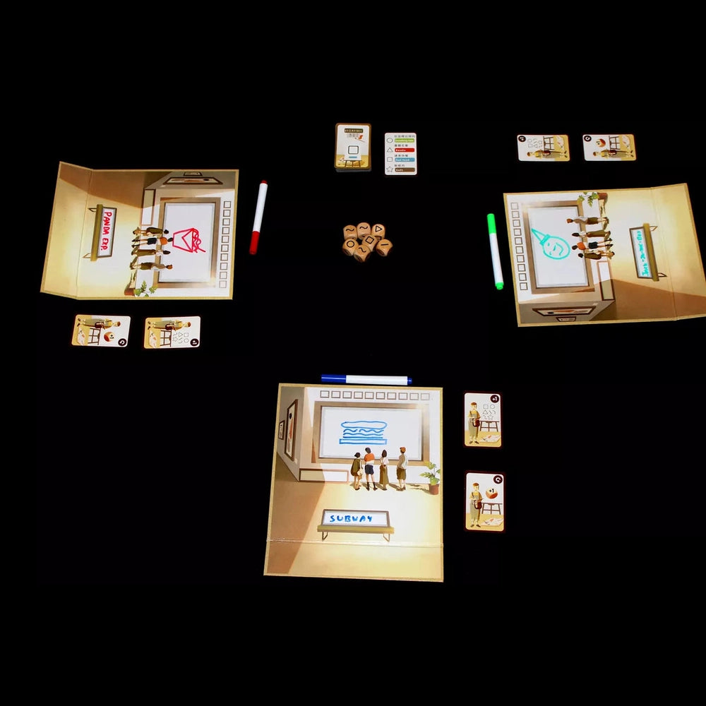 In Geometric Art , every round will exchange a guesser who guess questions. Each round there will be a theme. Within this theme, the artist can complete the artwork with the symbols specified above the dice. The guesser can guess the name of the artwork of every artist, If it's right, both get more rewards, but if guess wrong, both will be punished. Those who first get 10 points to win, but If you have too many penalty points, you will be eliminated.