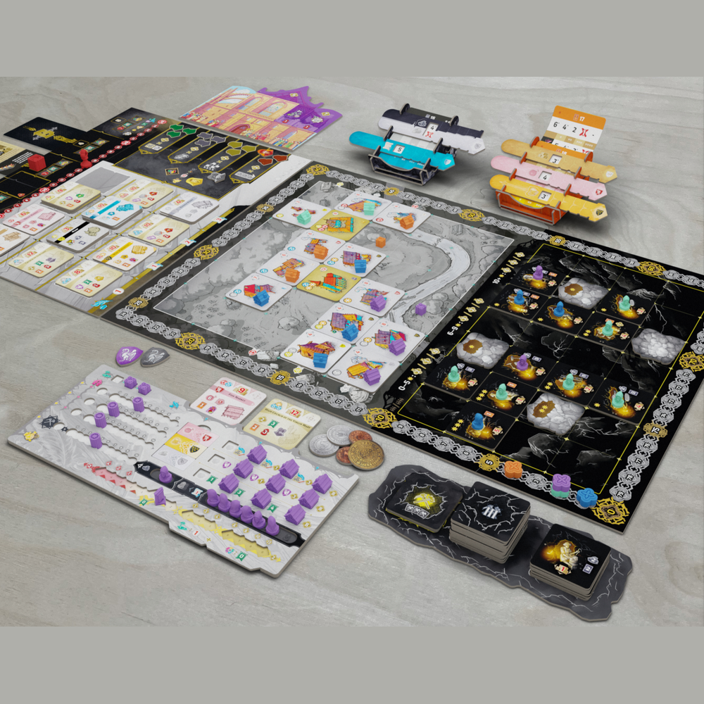 The asymmetrical nature of each player's available guilds makes for highly interactive rounds in which each decision impacts the economy and other players in interesting ways as they expand their mines and build infrastructure across a shared board.