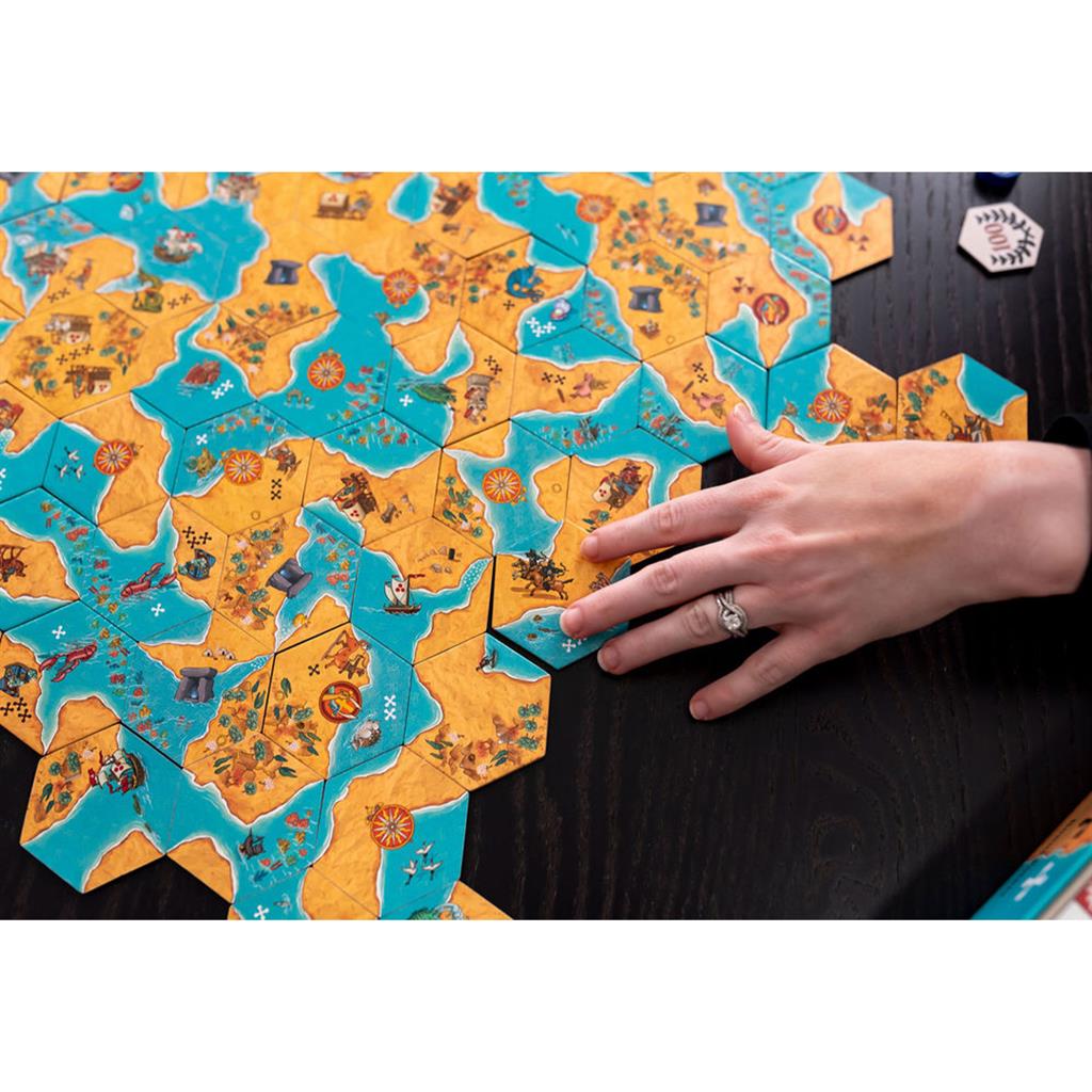 Part puzzle, part game. Play as either Land or Sea (or the Cartographer in a 3 player game). Each player plays with 2 double-sided hex tiles containing a mix of land and sea shapes. They take turns placing a tile each to make a map together. Land places tiles trying to complete land areas, and Sea places tiles trying to complete sea areas. Completed areas score a point per tile; land areas for Land, sea areas for Sea. Some tiles score bonus points for whoever completes the area they are in. So players may decide to strategically complete rival’s areas to gain their bonus points. Other tiles allow players to play their second tile, or steal a player’s tile - but not their last one!