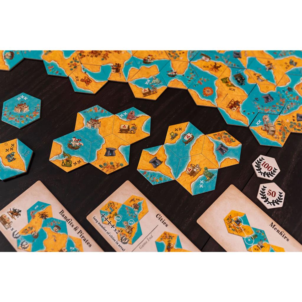 The strategy of the game involves careful tile placement to score from as many land or sea areas as possible, while minimising your rivals’ opportunities to score from the tiles you play. Watch your rivals’ possible plays, and control tempo strategically with Play Again and Steal tiles. Look out for opportunities to score valuable bonus points in your and your rivals’ areas. Carefully select tiles as you replenish your hand to prepare for your next turn.