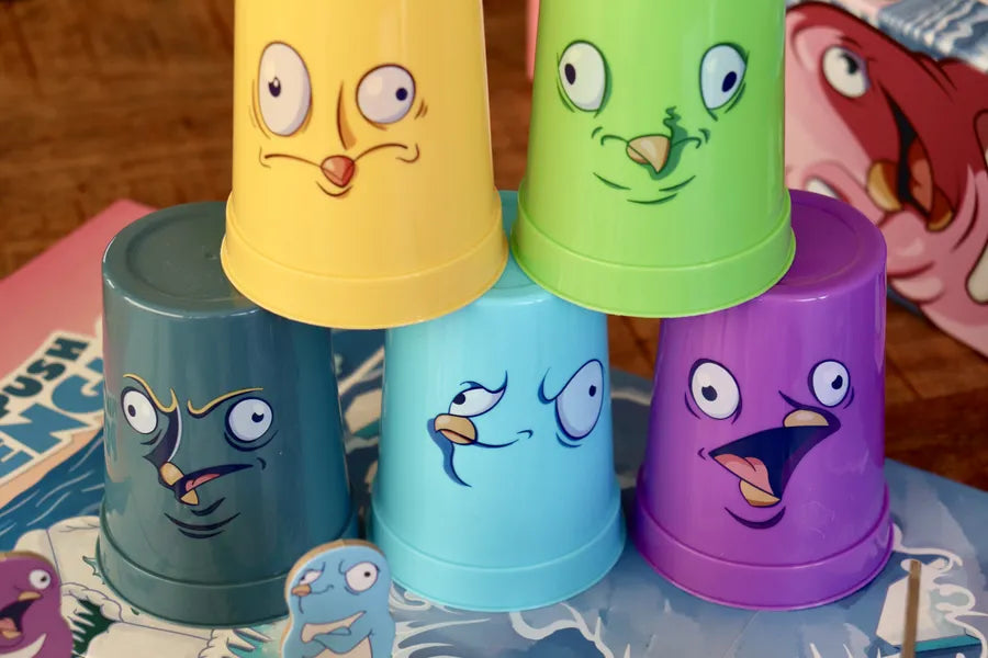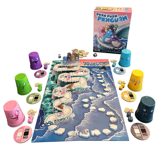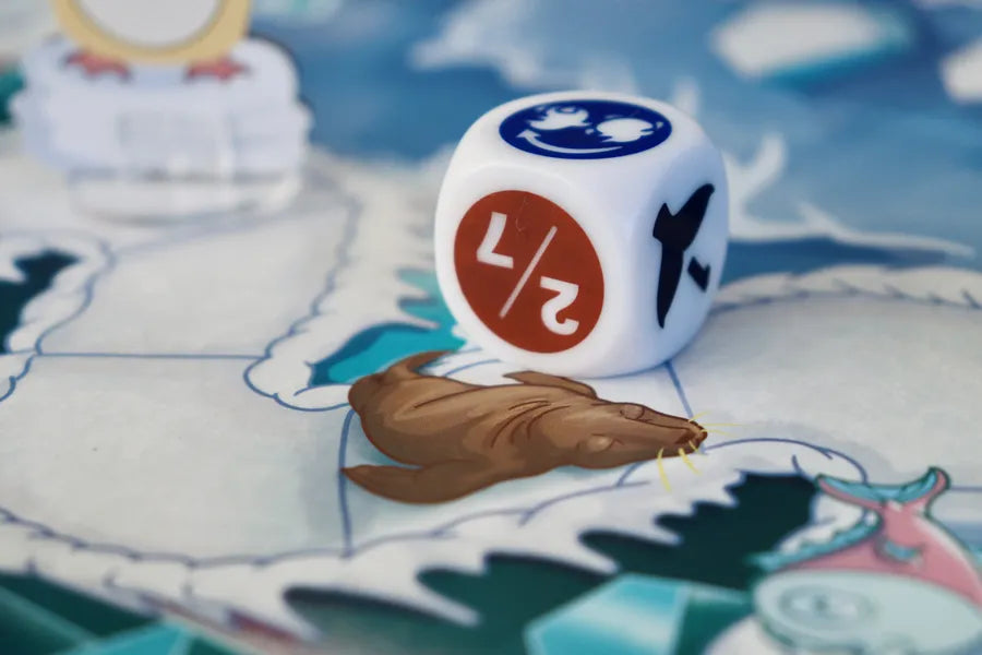 To play, all players roll their Penguin Dice. Players use their Penguin Cup to shake their dice and hide them. They secretly select which of their dice they want to use for movement then reveal the dice at the same time. Starting with whoever has the Orca Die, each player takes a turn gobbling up fish and moving their penguin. They push any penguins they land on or interact with special spaces. After all players have taken their turn, the player with the Orca Die rolls it and moves the Orca.