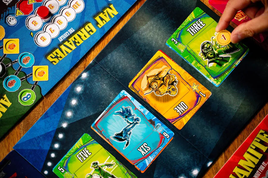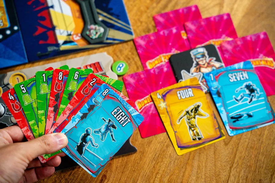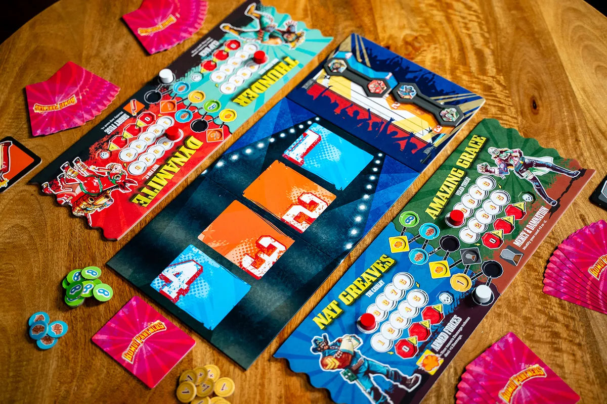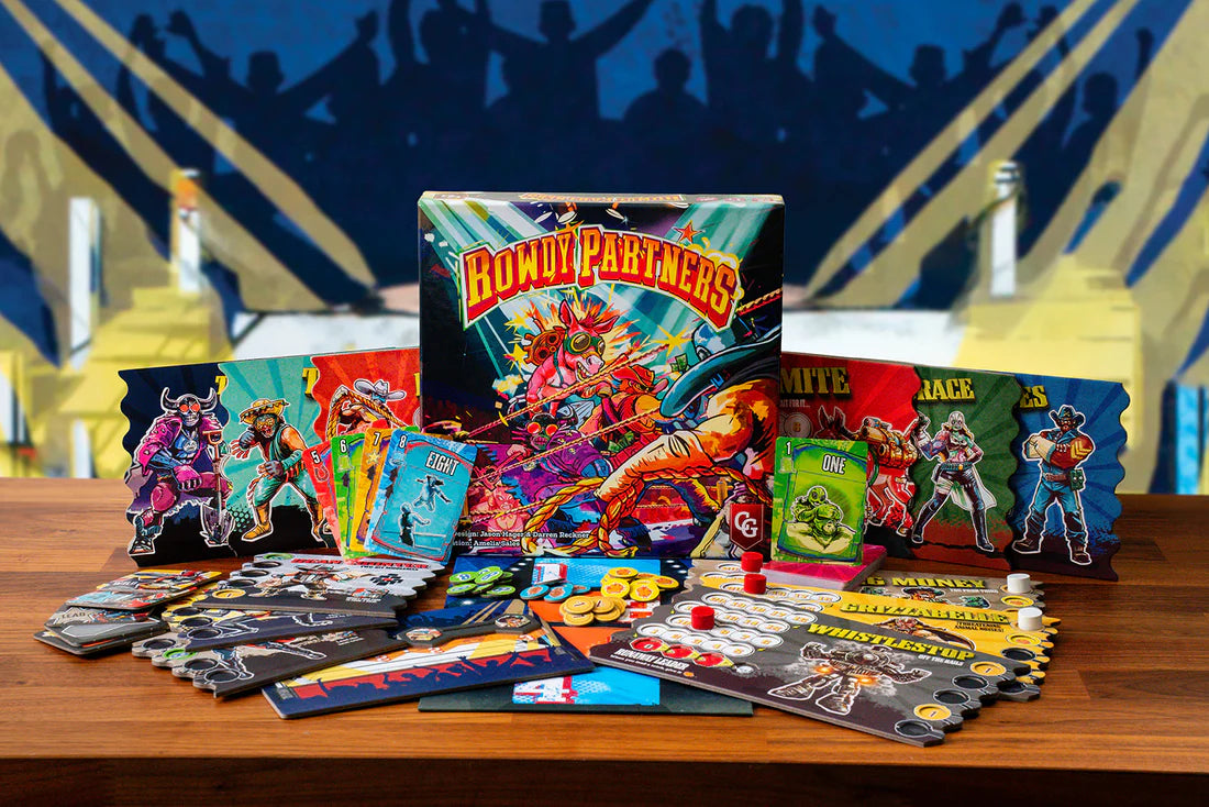 Rowdy Partners is a team trick-taking game played over a series of rounds, with each round being composed of eight tricks. Work with your partner to beat the other players by draining their health through calculated strikes and sneaky counters. Swap wrestlers mid-match, unleash signature moves, and collect Pop to gain the upper hand. The team that first pins one of their opponents wins!
