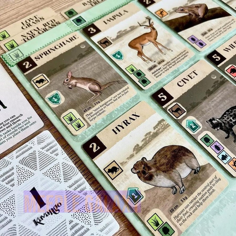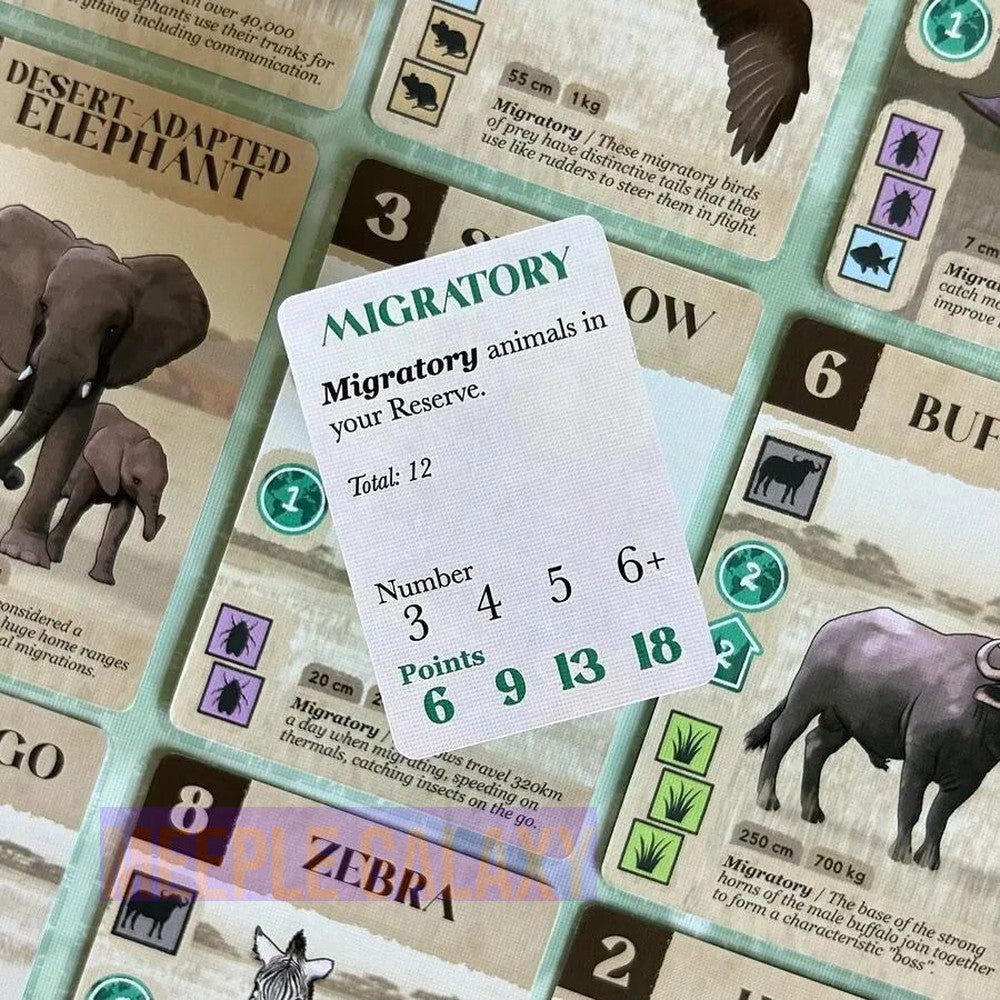 Travel to the vast wildernesses of Southern Africa and step into the role of a Conservation Expert. Embark on a re-wilding journey as you transform your own unique landscape into a thriving nature reserve. Over three fast-paced rounds of simultaneous turns and card drafting, you will build a flourishing ecosystem. As you grow your nature reserve, you must complete research tasks to earn money to invest in protection and provide a haven for vulnerable and endangered animals. As the game progresses, your choices become harder and your strategy more complex as you aim to build the highest scoring nature reserve.