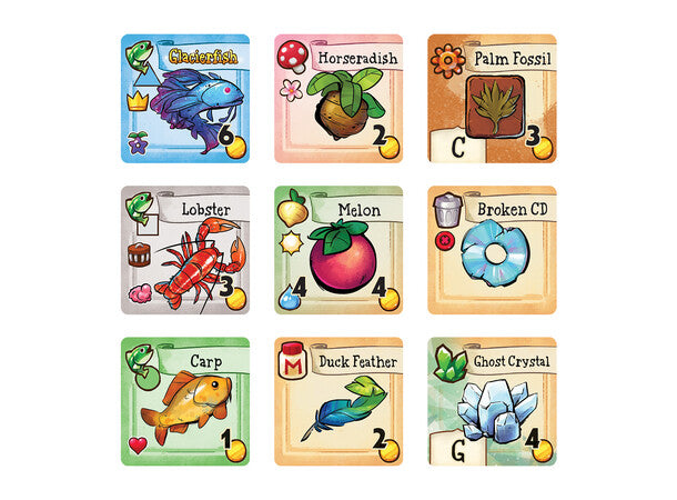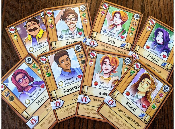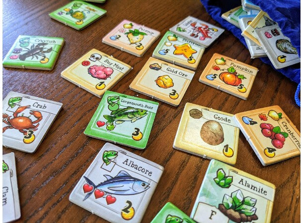 The goal of the game is to complete Grandpa's Goals and restore the Community Center, which requires you to gather different types of resources represented by tiles. You have a fixed amount of turns to accomplish this. This is driven by the Season Deck of 20 cards, one of which is drawn each turn to trigger certain events. Cooperatively the players decide each turn where they will focus their individual actions and place their pawn in that part of the Valley. Using their actions, they visit specific locations, trying to gather resources to complete their collective goals. Actions include things like: watering crops, trying to catch fish, rolling dice to explore the mines, and many more. When the Season Deck is exhausted, the game ends.
