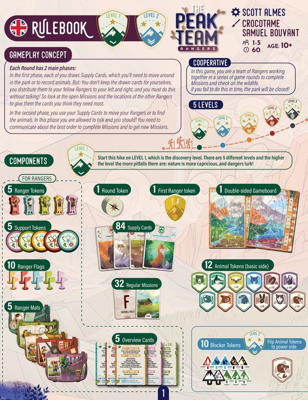 The main board represents the wildlife reserve, dominated by a towering mountain divided into distinct regions. Using a "reverse-drafting" mechanic, where each player assigns their cards to others, rangers will acquire the tools they need to explore the mountain via different paths and transportation systems.