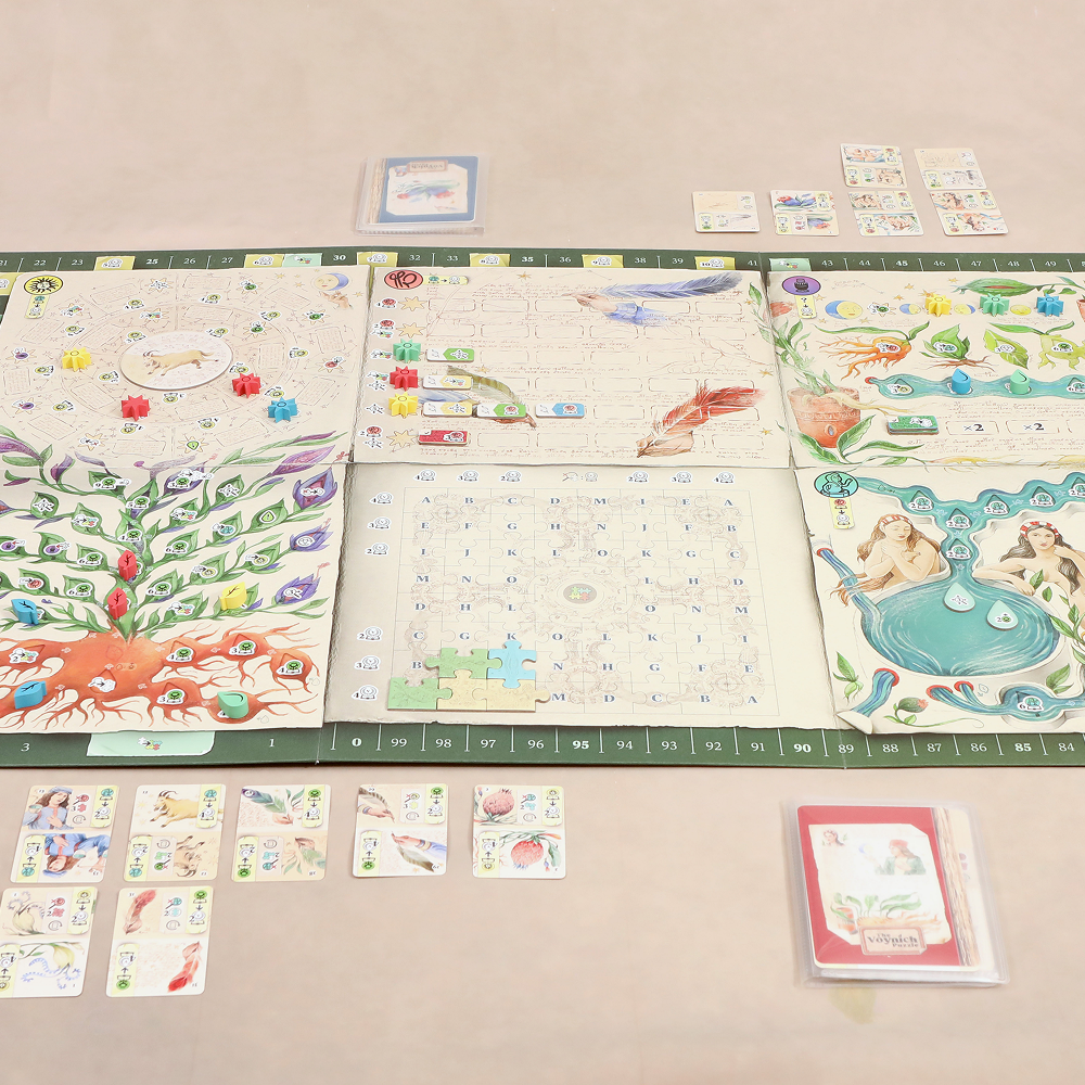 In The Voynich Puzzle, you will collectively try to decipher the Voynich manuscript, using your copy of the book as the main tool to do it. As the collective understanding of the manuscript grows, you will be able to gradually decipher pages on your book, improving your chances to decode it. The player with the most overall knowledge at the end of the game, will be the winner.