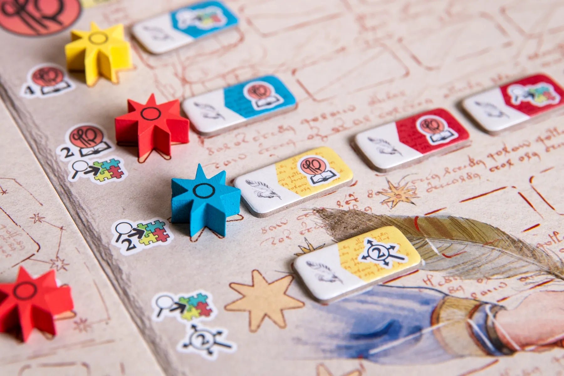 On your turn, you will select a double page on your book, and perform the actions on the top side of those pages(cards). Each pair of pages will allow you to interact with one of the 5 main sections of the manuscript (botany, astrology, baths, writing and recipes). Once you gain enough knowledge on an area, you will share that knowledge, adding a piece of the puzzle that the manuscript represents. All players will have access to that knowledge, helping them decipher the manuscript, which is represented by the turning and flipping of the cards in your book. Deciphering the manuscript gives you access to better actions and endgame scorings, so it should be your main focus of the game.