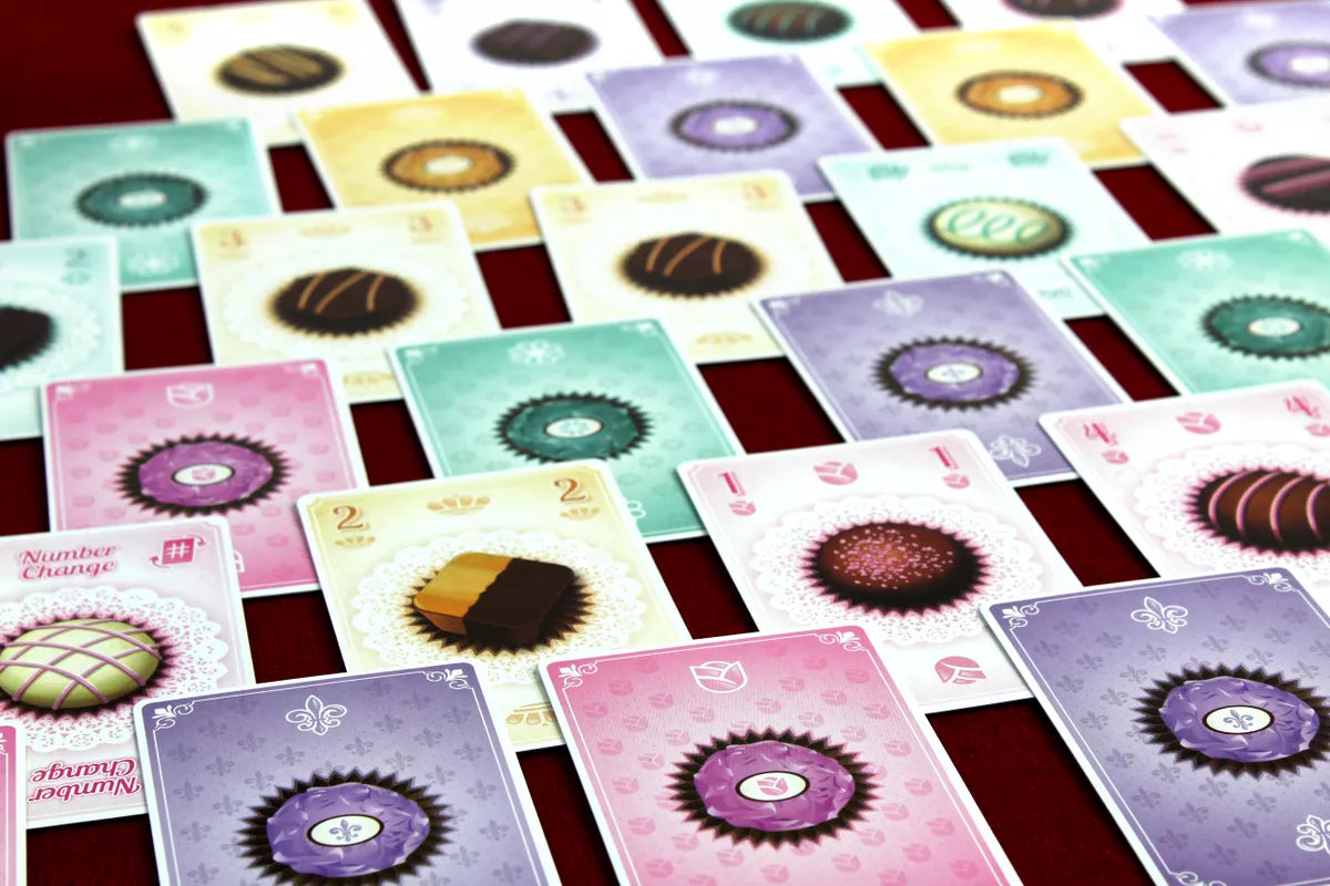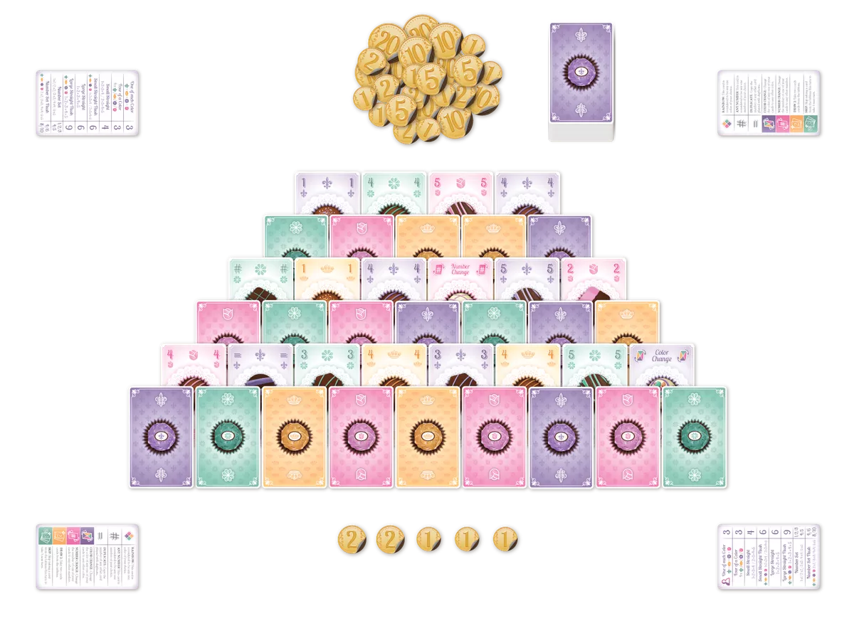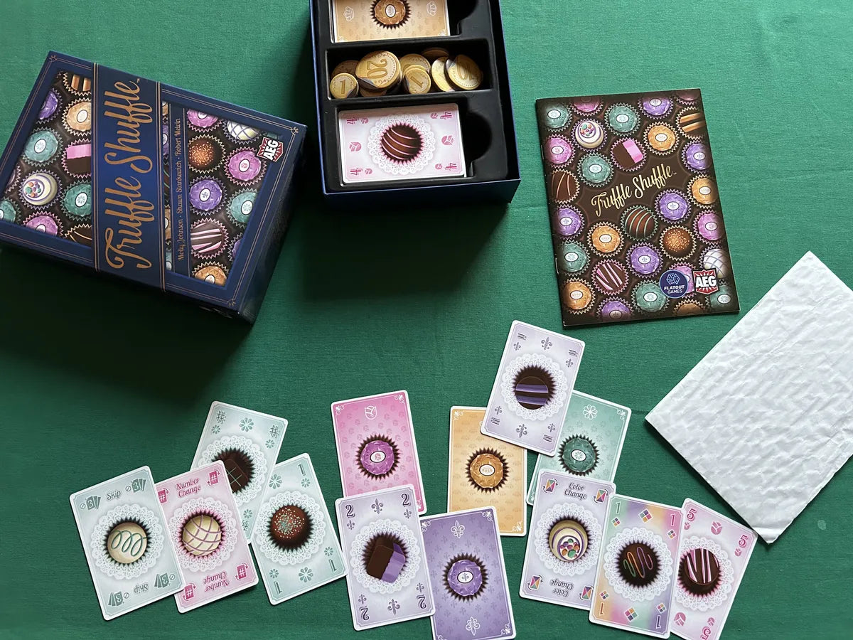 In the quick-playing, card-drafting game Truffle Shuffle, players take turns selecting truffles from a shared box of overlapping cards in order to make their own arrangements of chocolates to sell. Players can complete a variety of sets, using special modifiers and action cards. With so many different chocolate truffles to unwrap and different ways to combine them, every game of Truffle Shuffle is unique!